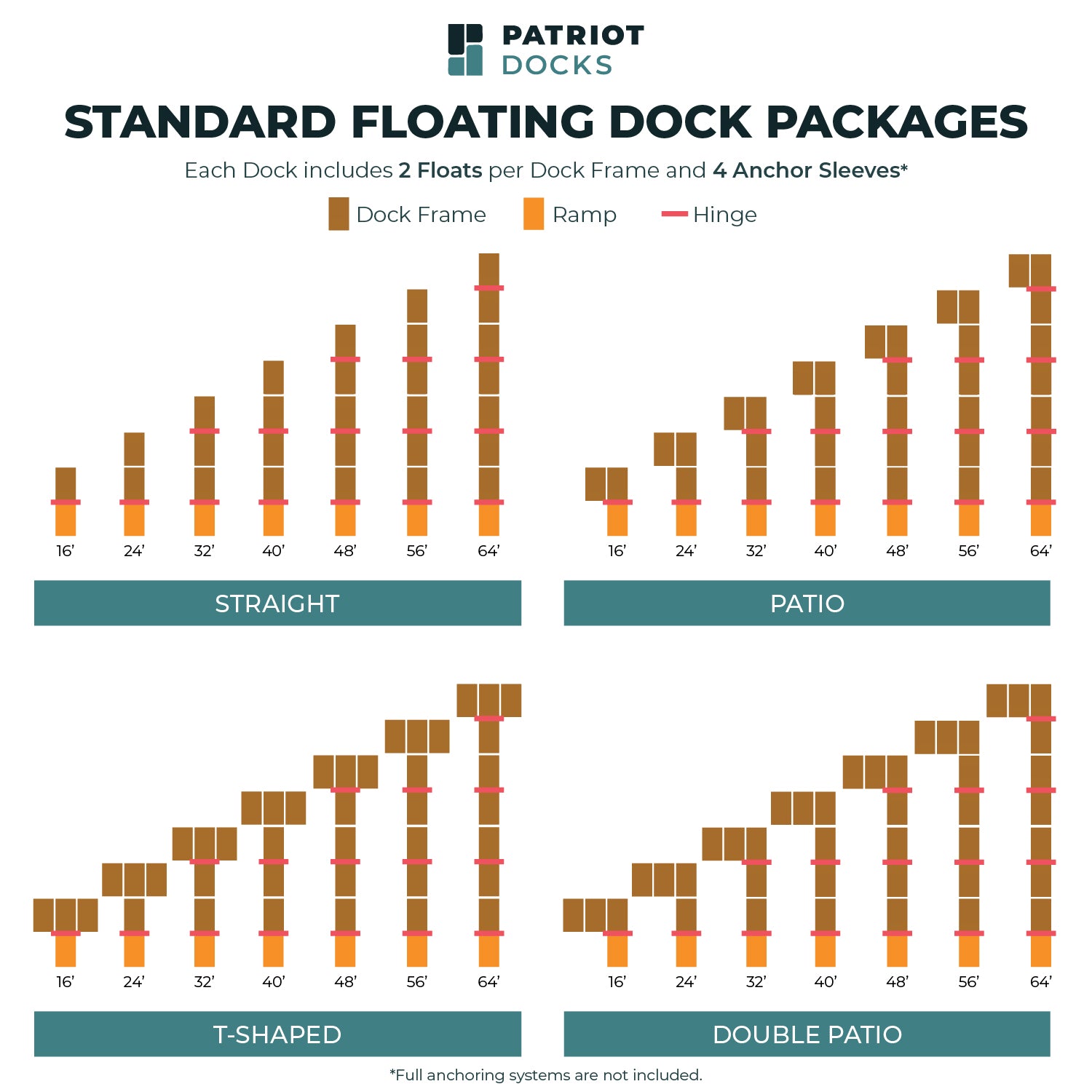 Patriot Docks Floating Dock Sections are modular, low-profile aluminum kits designed for ultimate flexibility in building your own dock system. Whether you're extending your existing dock, creating custom layouts, or adding new features like patios, boat slips, or swim platforms, these floating dock sections let you craft a dock that fits your lifestyle and shoreline.