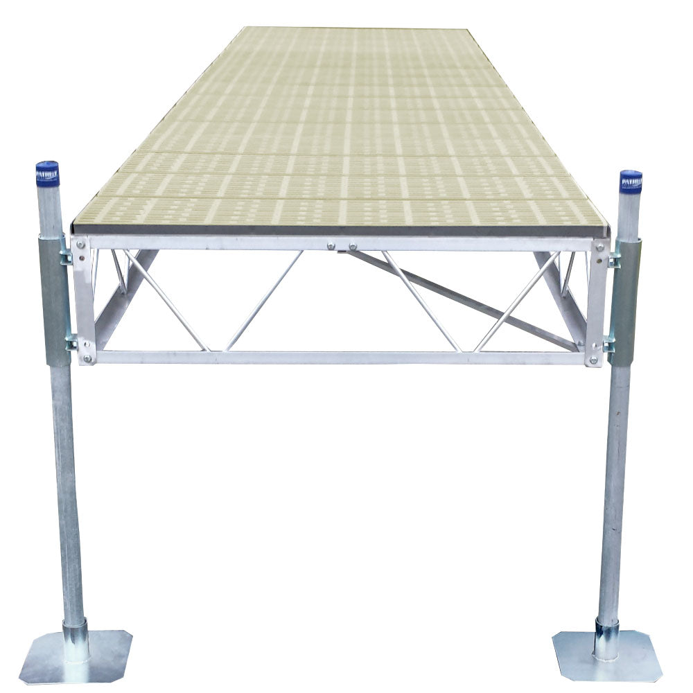 Each section is built with a tall aluminum truss frame, delivering exceptional strength and wave resistance. This elevated design makes it ideal for deeper water, windy conditions, and high-traffic areas. The included galvanized pipe supports can be driven into firm lake bottoms or adjusted for mucky conditions, giving you complete flexibility in where and how your dock is installed. Supports are required only every 16 feet of dock length and at exposed dock corners, keeping installation simple while maintaining stability.