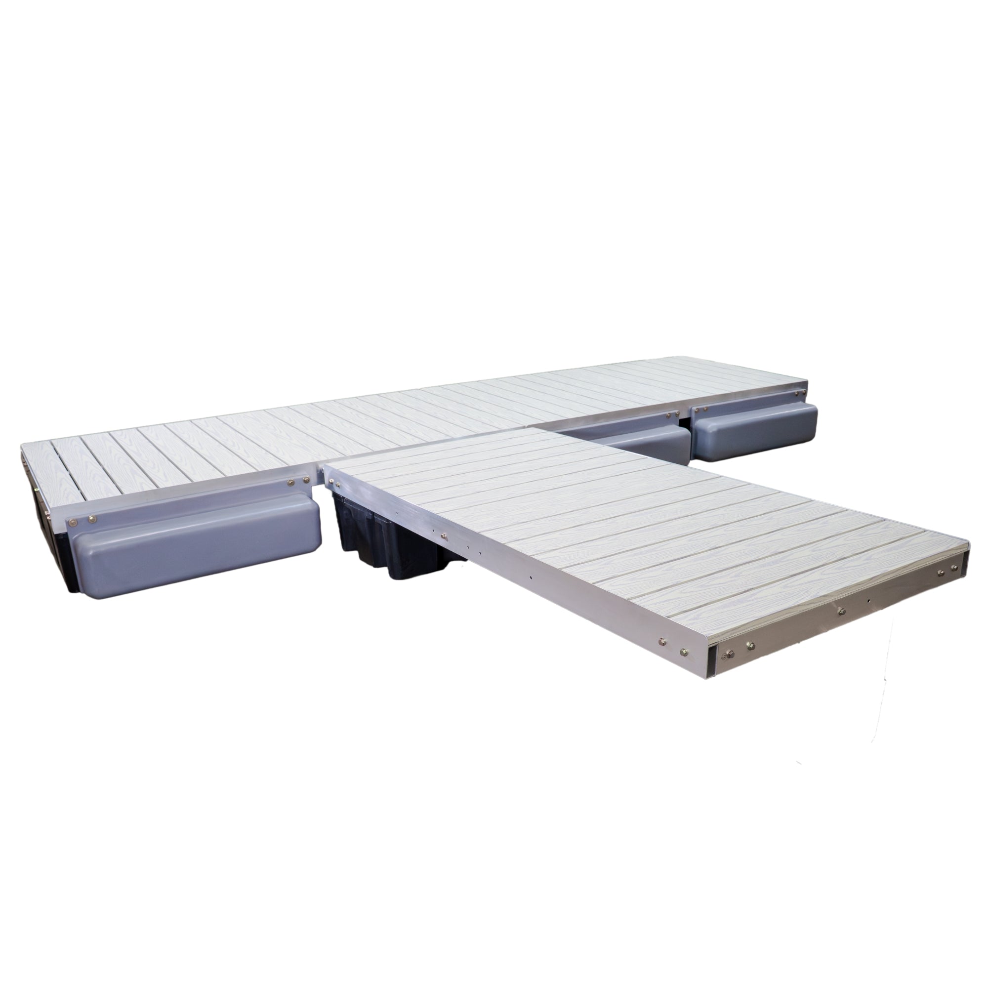 Each system includes a 4x8 ft hinged aluminum ramp that connects from the seawall or shoreline to the floating dock platform. Like all sections in the system, this ramp uses marine-grade aluminum frames, drop-in decking panels, and durable floating dock hinges for smooth, reliable articulation. Whether you’re dealing with fluctuating water levels or space constraints, this dock gives you maximum versatility with minimal effort.