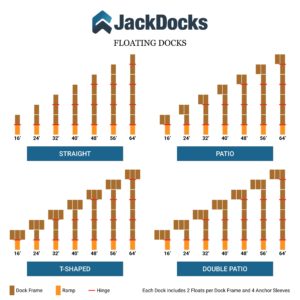 Aluminum Floating Docks are perfect for changing water levels, very deep water, and very muddy lake bottoms. There is no limit to the water depth for these docks! Furthermore there is no limit to the shapes and possibilities you can build with the bolt-together aluminum frame. Jack Docks features a long-lasting aluminum floating dock frame, premium drop-in decking panels, foam filled floats, hinges and an approach ramp. These dock packages are complete kits. They provide options to select the best dock to meet your unique needs.