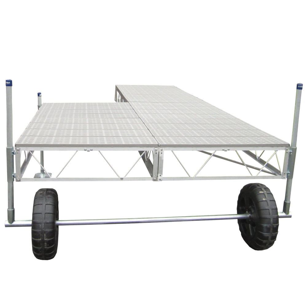 Sinks and fills with water for stability; Wide 8-inch tread; Moveable to middle or end of dock; Strong full axle