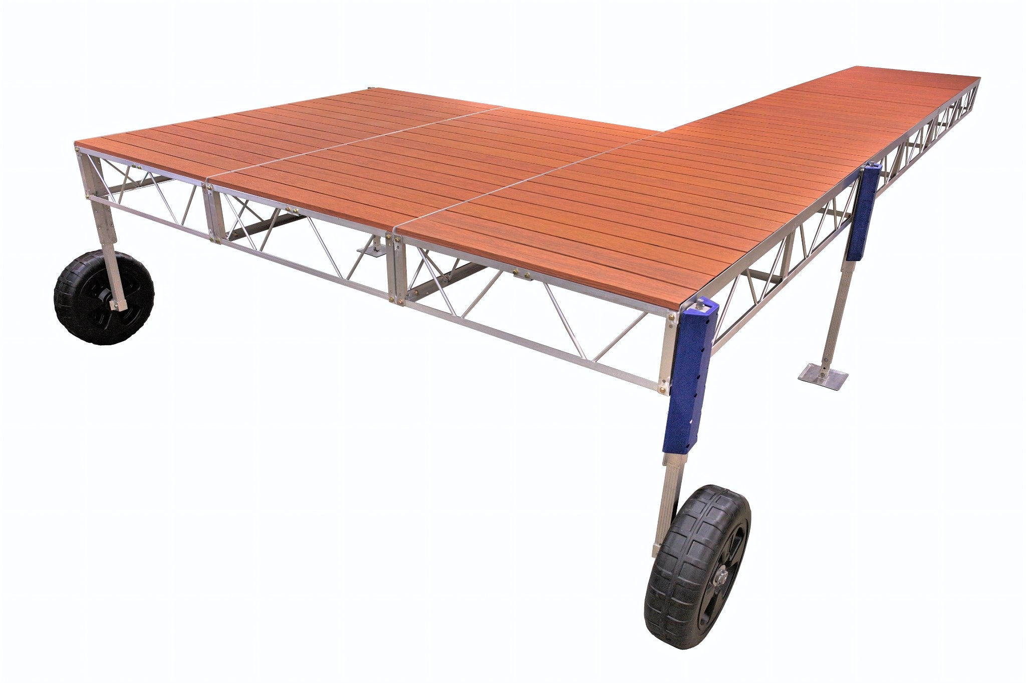 • Roll-in Jacks: The mounted wheels on adjustable supports make it easy to roll the dock in and out of the water — no waders required.